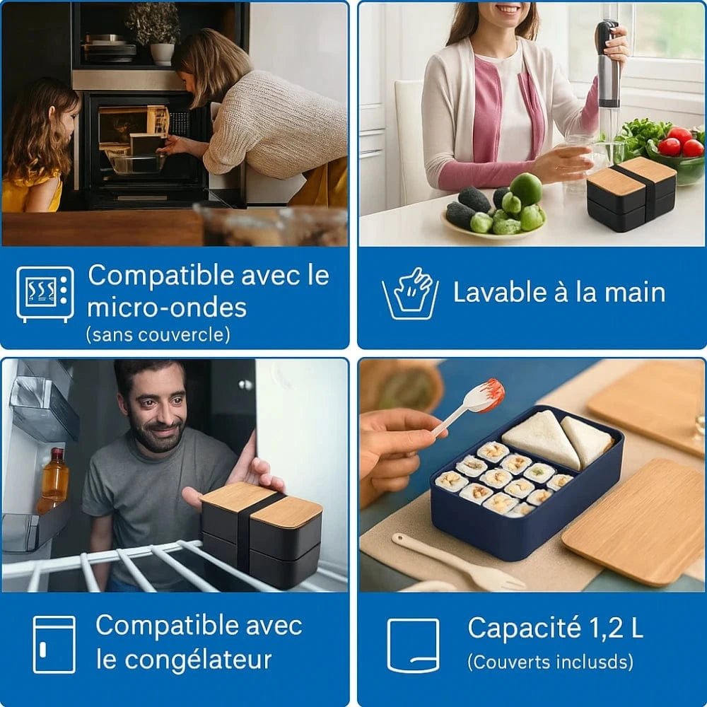 Grâce à son couvercle en bois naturel et son format double couche de 1200 ml, cette lunch box conjugue style raffiné et organisation parfaite de vos repas.
